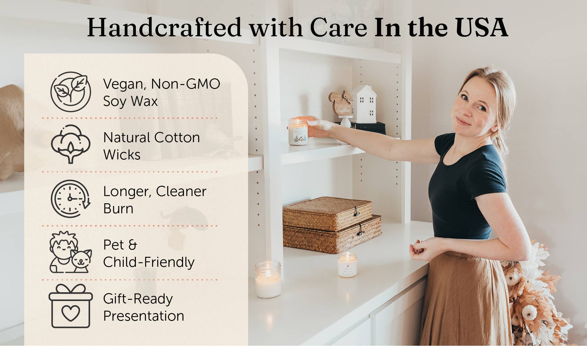 Our Home Is Where the Heart Is candle in Warm Wishes is a cozy, inviting scent that blends creamy, woodsy, and fresh notes. Vanilla and butterscotch add a touch of sweetness, while cinnamon, nutmeg, and cloves bring a hint of spice. The fragrance finishes with warm cedar, patchouli, and amber, creating a soft yet strong scent that feels both comforting and familiar. A great addition to any shop, this candle is perfect for customers looking for a warm and cozy home fragrance.