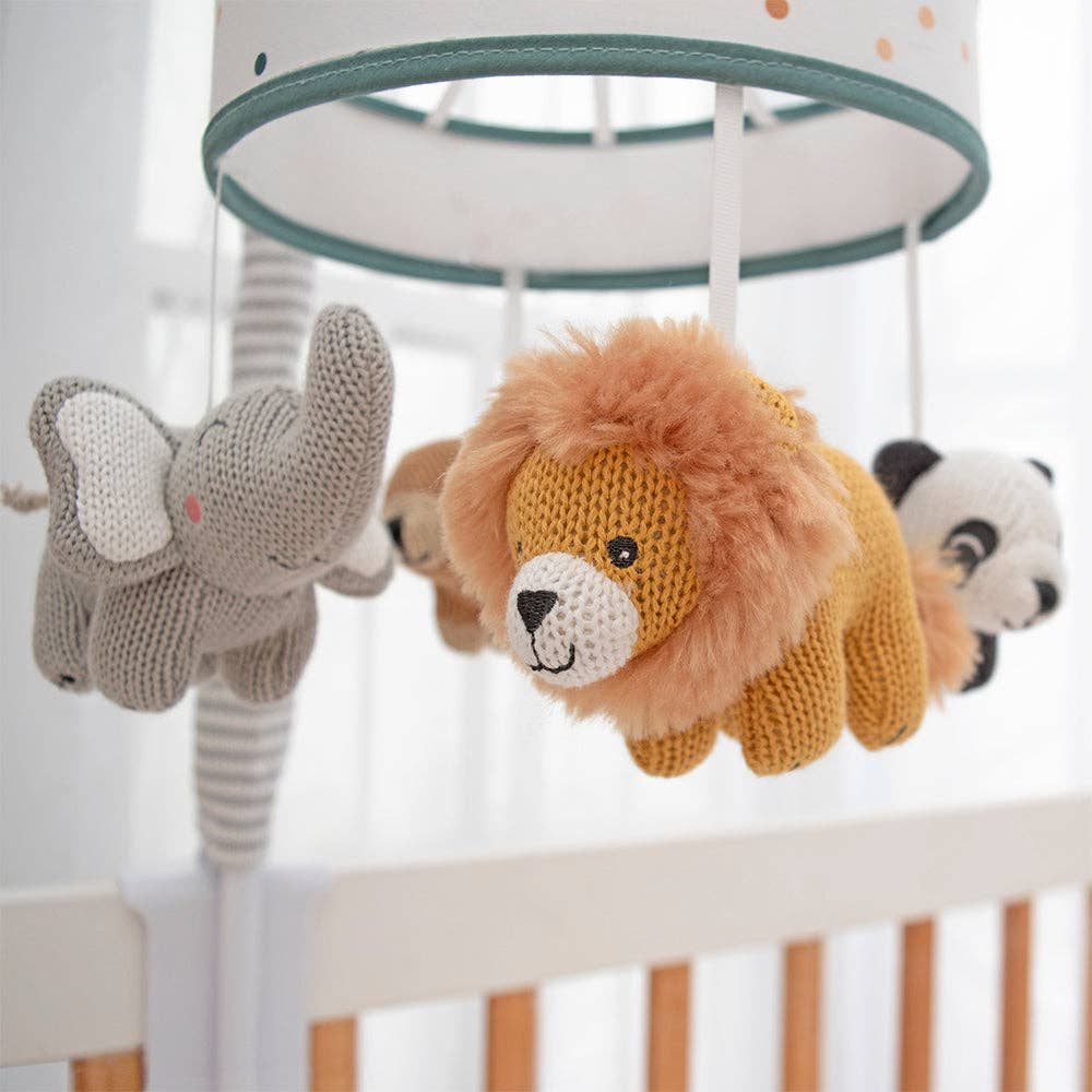 Little ones are going to love watching these zoo animals overhead to Brahms lullaby as they drift off to sleep. This gorgeous musical crib mobile features 100% cotton knit animals with exquisite detailing and is the perfect finishing touch to your nursery.